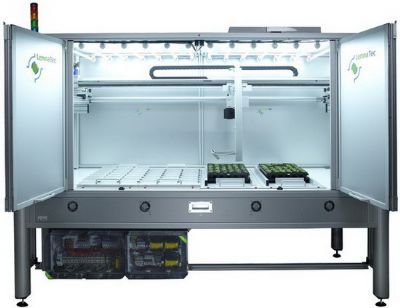 全自动、高通量对大量植株进行成像 特别适合植物功能基因组学和植物表型组学 遗传育种、突变株筛选、表型筛选的强大工具 机器人技术、图像分析和大规模计算能力的**结合 实验室高通量植物成像系统——Scanalyzer HTS是一套可以全自动、高通量对大量小植株进行成像的系统,可以选择配置可见光(VIS)成像、近红外(NIR)成像、红外(IR)成像、荧光成像或激光扫描3D成像(只适合高度15 cm以下的小植株)中的一种或多种。成像系统带程控移动装置,可以在X轴和Y轴上进行移动,并配有射频或条形码读取器。Scanalyzer HTS系统通过软件控制摄像头移动到样品上方(多孔板或小盆)进行拍照,照片数据与该样品的电子标记(射频或条形码)一起存储。软件也可控制摄像头对多孔板上的每个孔进行单独成像,每个孔的数据分布存储(告诉软件多孔板类型,然后自动编码,如A01、A02……)。(下载演示视频) 软件可以控制系统每天自动对样品进行成像,获得样品成像的时间动力学变化。只要点击样品的编码,就可以获得样品的图像及分析数据的时间动力学变化,并可进行复杂的统计学分析和图表分析。 系统提供顶部光源和底部光源,并可通过软件控制光强变化。根据测量样品数目的多少,可以选择配置4、24、48或72个多孔板的版本,不同版本的外观尺寸差别很大。如有特殊需要,可以定制更大版本。 由于全自动、高通量测量获得的数据非常庞大,本系统必须配置服务器来存储数据。选购PHP远程数据库软件,还可以对系统进行远程原理、控制和分析。 主要功能 ◆ 全自动、高通量对植物等小型样品进行可见光成像、近红外成像、红外成像、荧光成像(包括整株GFP成像)和/或激光扫描3D成像(每套系统可选择一种或多种) ◆ 通过可见光成像可以测量植物的结构、宽度、密度、对称性、叶长、叶宽、叶面积、叶角度、叶颜色、叶病斑、种子颜色、种子颜色面积等等50多个参数 ◆ 通过近红外成像可以分析植物的水分分布状态、水力学研究、胁迫生理学研究等 ◆ 通过红外成像可以进行植物干旱胁迫研究、蒸腾研究等 ◆ 通过荧光成像可以分析植物的生理状态 ◆ 样品可以是培养在多孔板中(如12、24、48、96、384孔板),也可以是长在小花盆中。 ◆ 高通量测量大量样品,标准配置可选择装4、24、48或72个多孔板的版本 ◆ 花盆大小范围,直径3.64 ~ 20.51 cm,高2.79 ~ 15.44 cm ◆ 可选择成像分辨率,特别适用于96孔板高精度测量 ◆ 进行动物/昆虫的游动/运动测试时,可自动获取图像 应用领域 植物功能基因组学、植物表型组学、遗传育种、突变株筛选、植物生理学、农业科学、植物病理学、植物形态建模、植物生物信息学、种子生理学、种子病理学、植物胁迫生理学、植物水力学等研究领域。 HTS系统的成像扫描模式